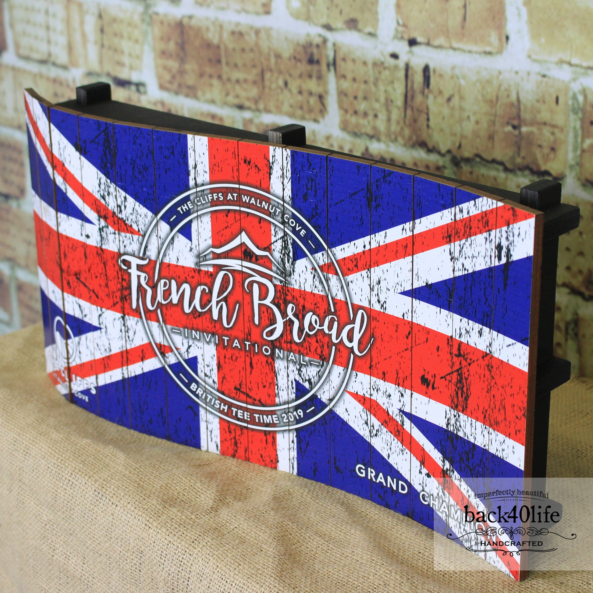 This outstanding trophy resembles a flowing flag. The entire face of the trophy is made from painted wood pieces assembled to created the flag curve. The tournament and club information are painted along with the event themed flag.