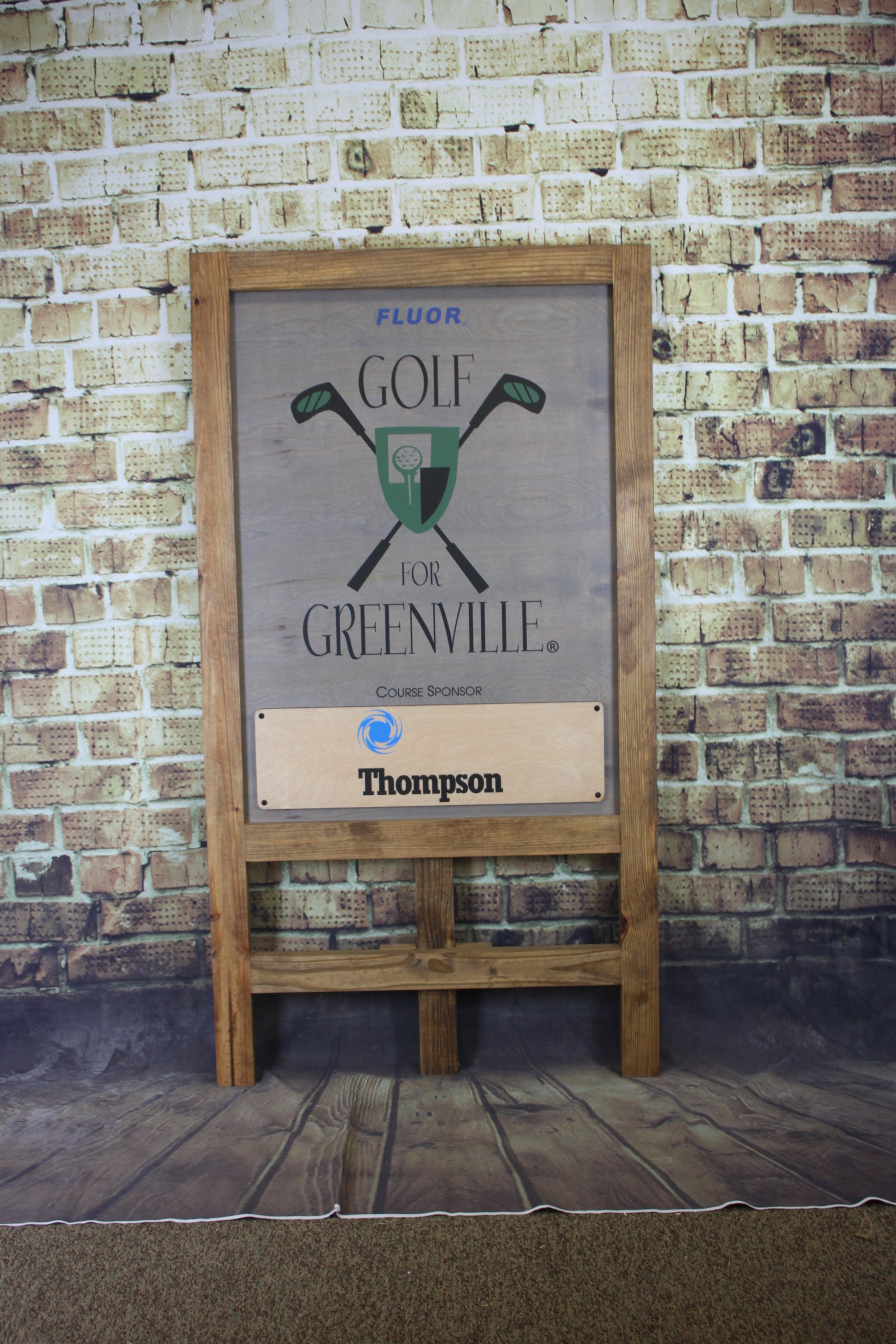 We created several of these A-Frame style trophies for an annual golf event. We created a removable plaque for each sponsor which was added to the stand to display during the tournament. The stained frame and panel have a study construction so it can be used for many years.