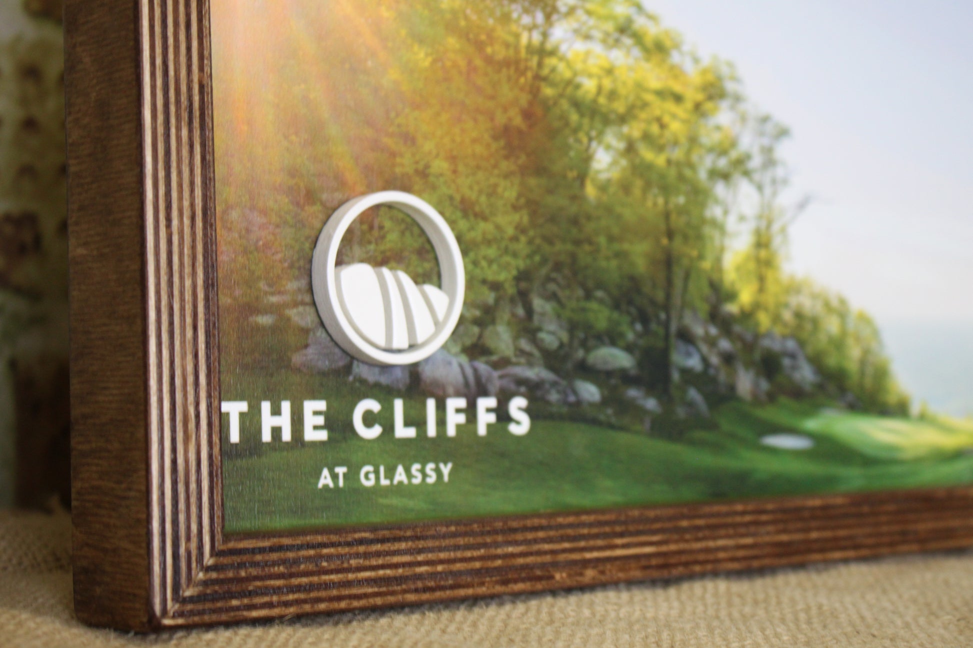 A beautiful picture of the final hole of the course sits from and center for this award. The tournament branding are painted across the top of the picture. The 3D club logo adds some depth to the piece and the stained farmhouse style frame ties the entire trophy together.
