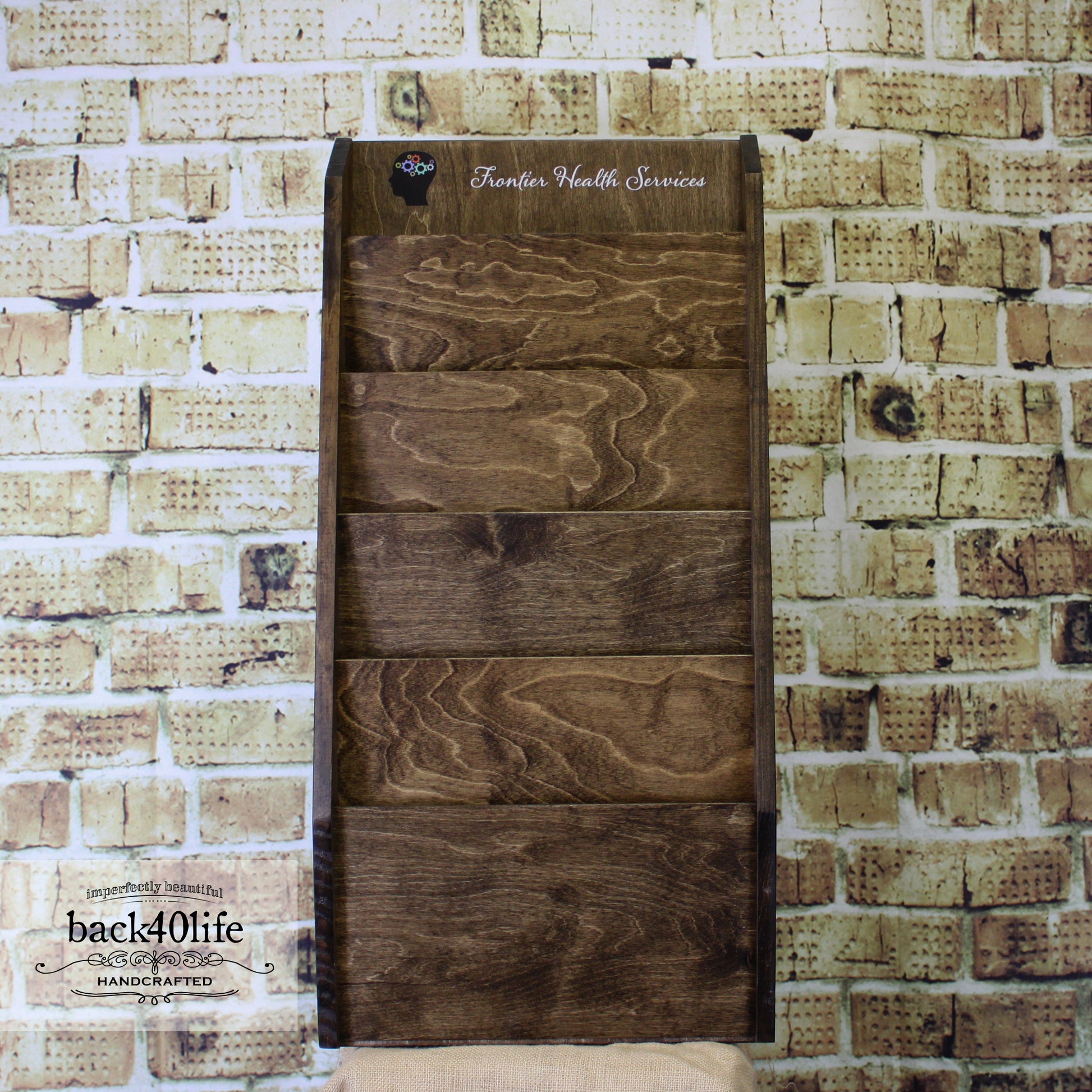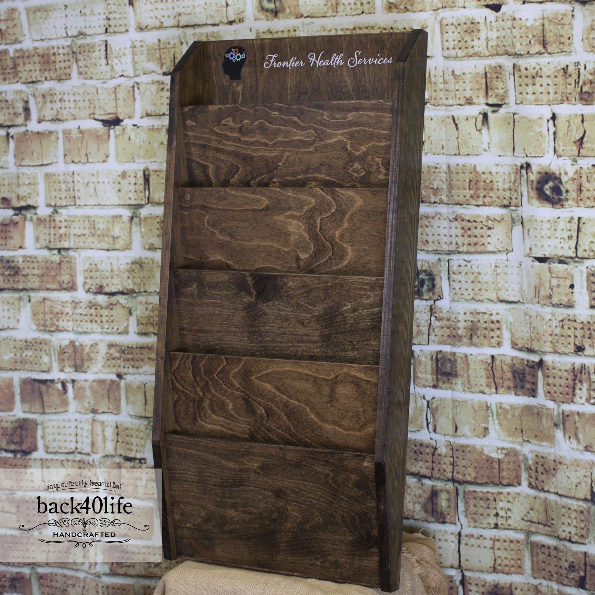 This wood file sorter was created for a doctors office. The piece is designed to hang on a wall and is sturdily built to see many years of use. The entire piece is stained and the office logo and name are painted onto the top of the design.