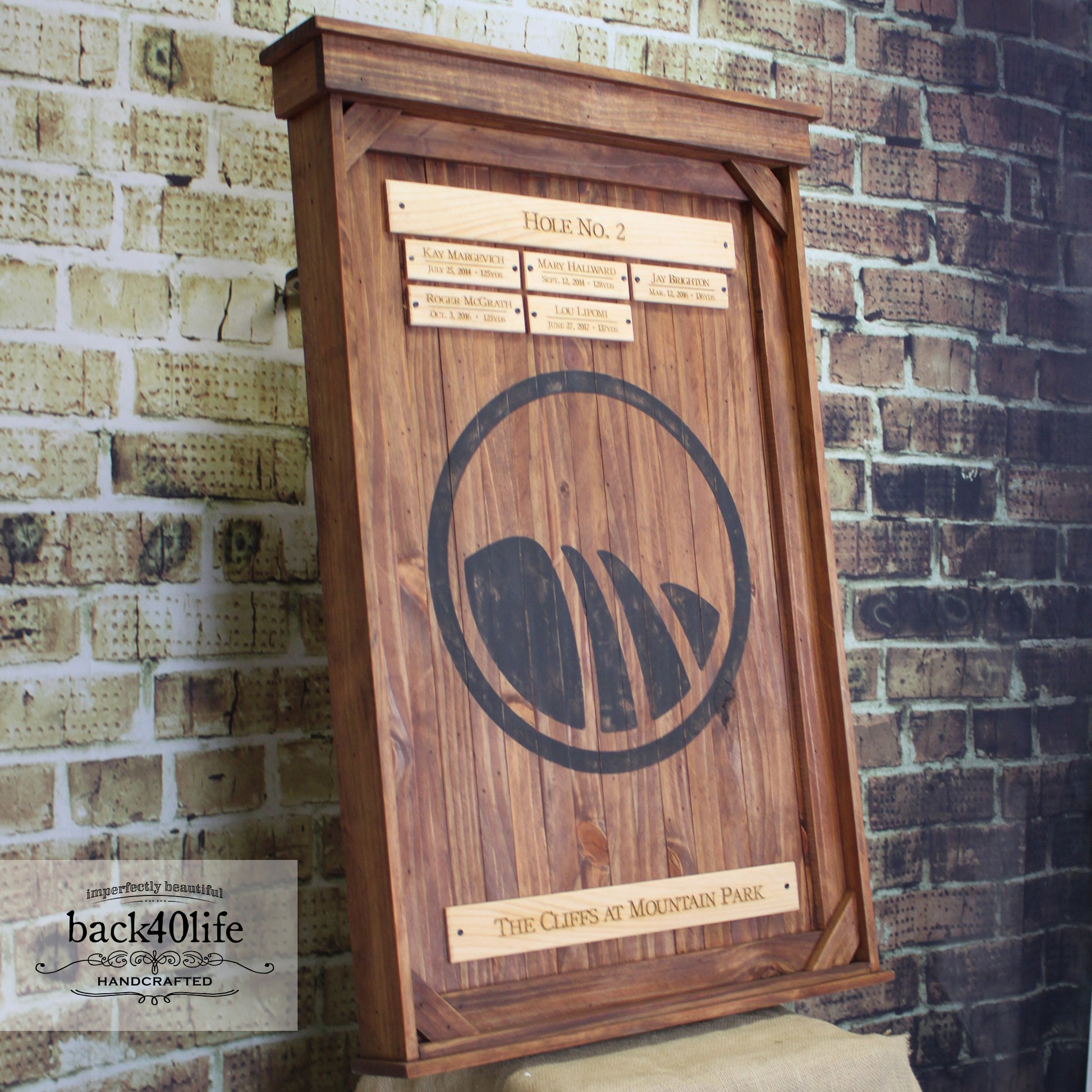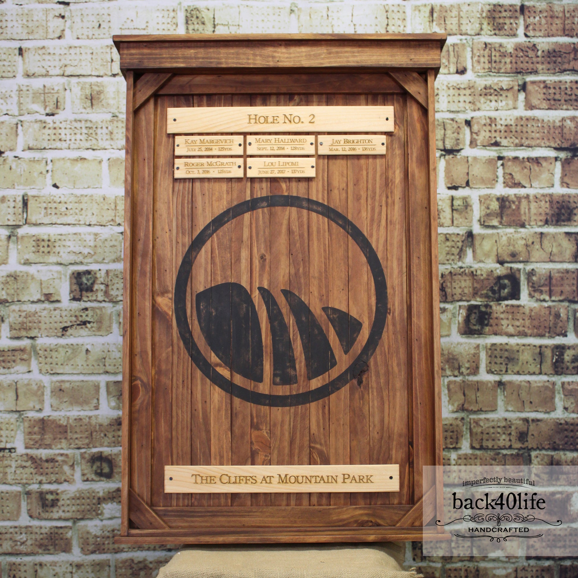Large rustic perpetual trophy for course hole in ones. Distressed club logo is painted on stained cedar panels for the backdrop. Engraved white pine name tags are attached with rustic nails to complete the piece.