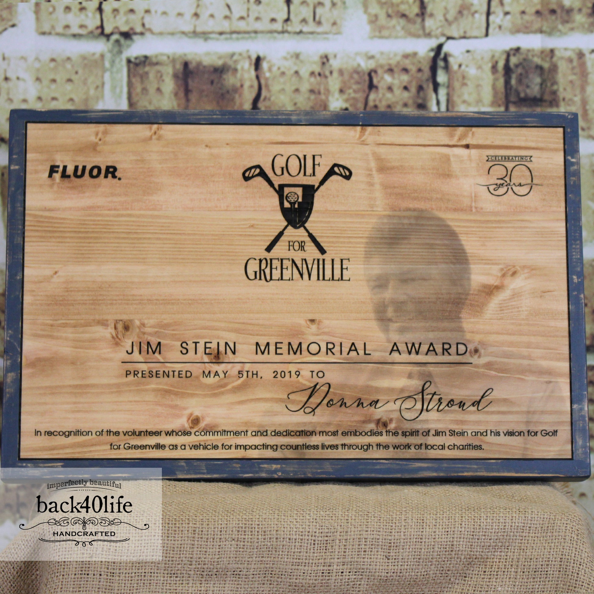 Jim Stein was influential in the Golf for Greenville community. We printed a picture of Jim onto a solid wood panel and then engraved the tournament branding and information over top. A distressed painted frame was added to complete the award.