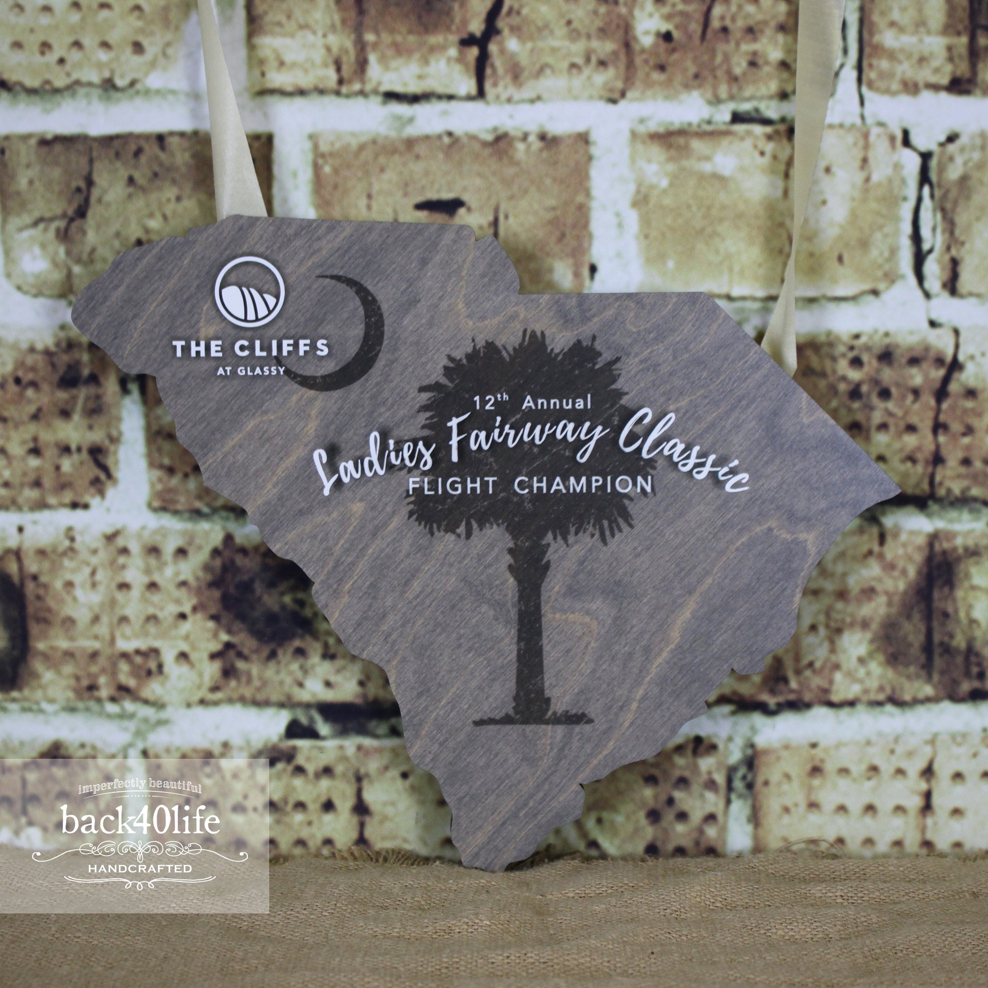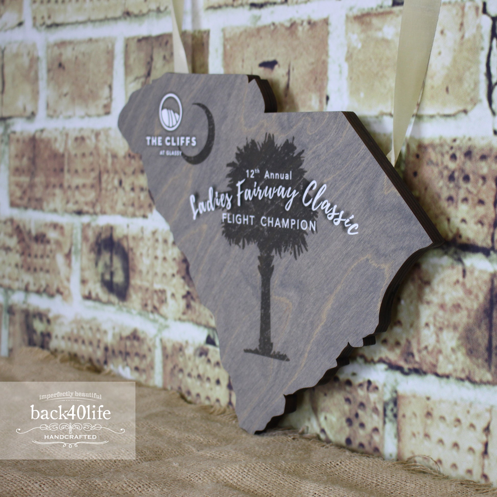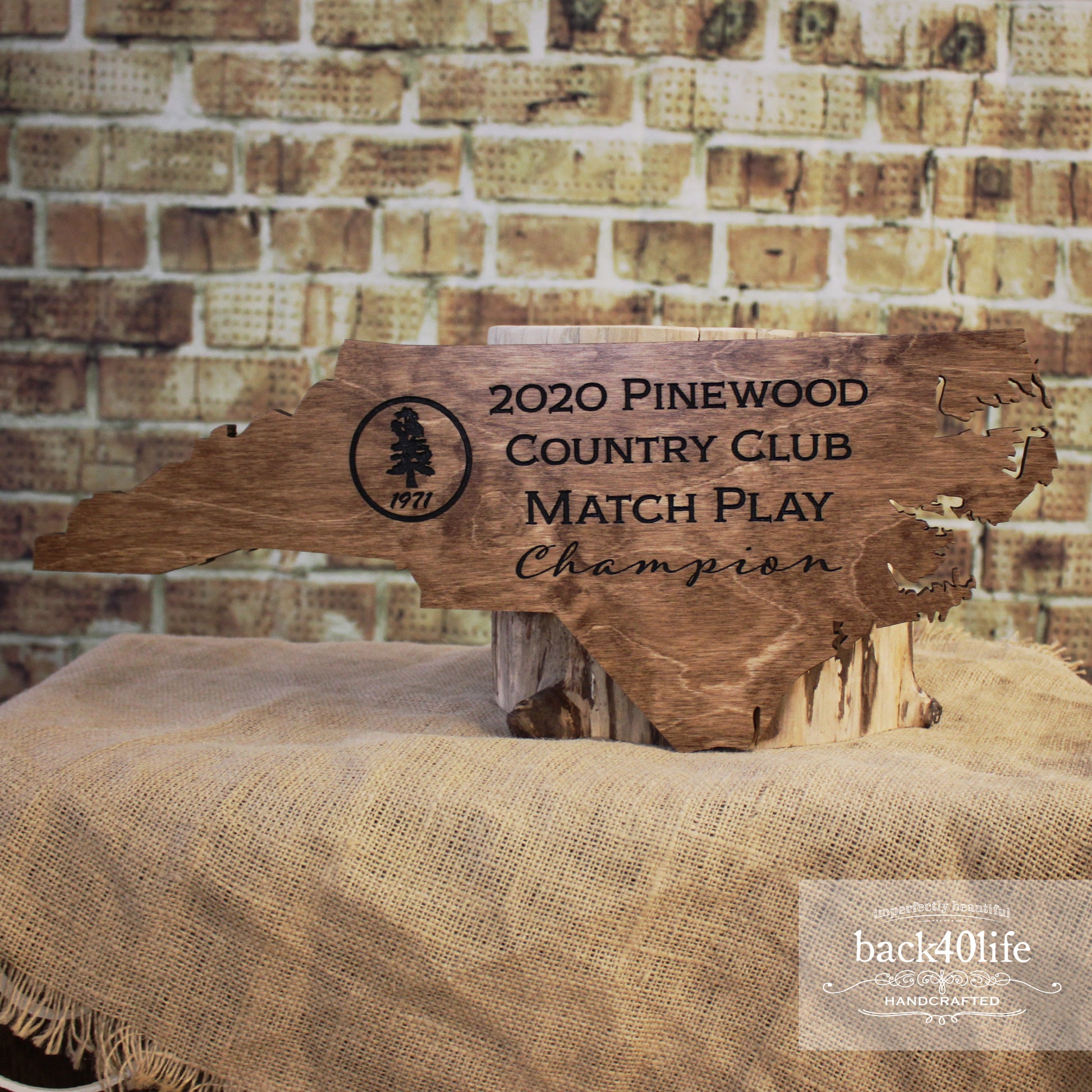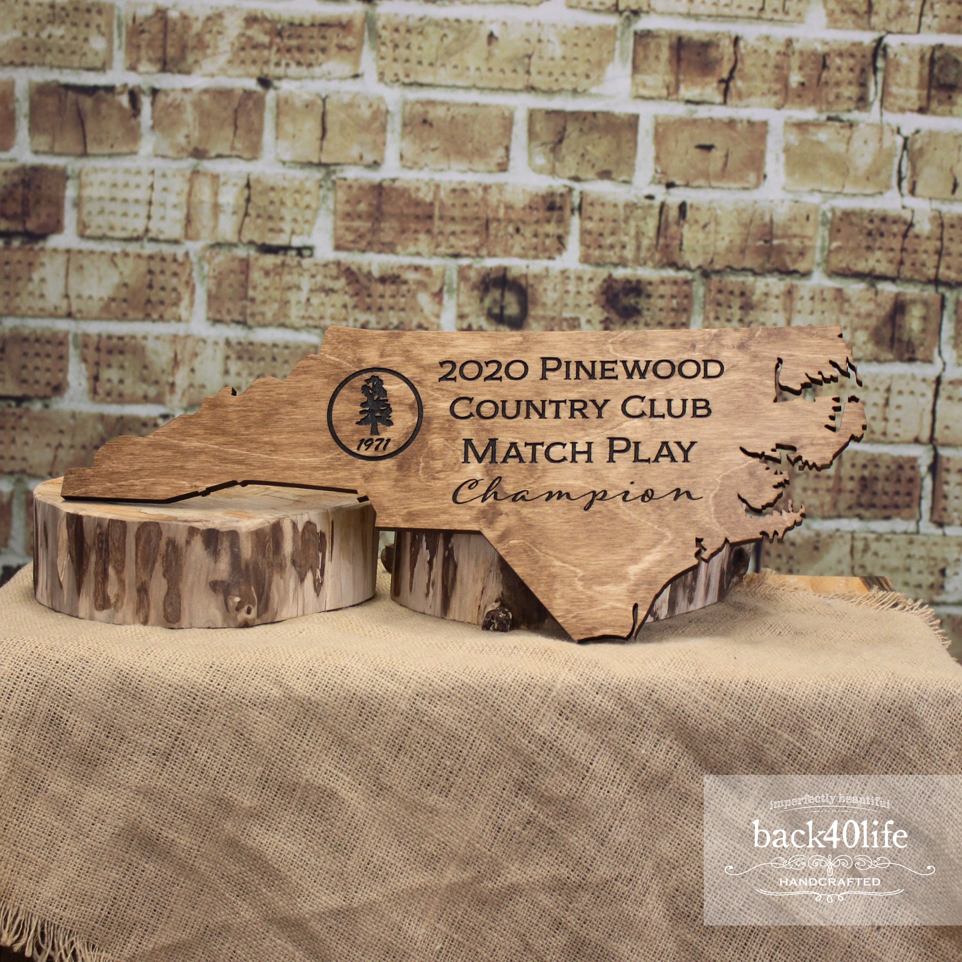 A detailed cutout of a state is accented by laser engraved tournament information and a club logo. We can build a stand to match or include hanging hardware to make it easy to display this awesome and unique piece.