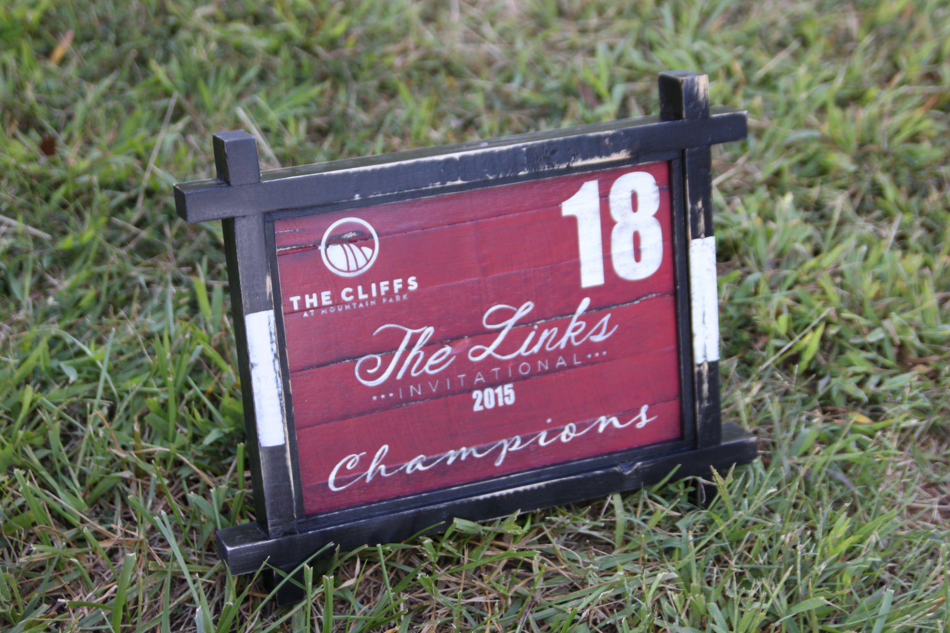 This unique trophy features an artisan frame, a distressed red panel and painted tournament branding and lettering. We created two sizes of trophy for the flight winner and overall champion. Over the past few years, we have created this trophy for this tournament.