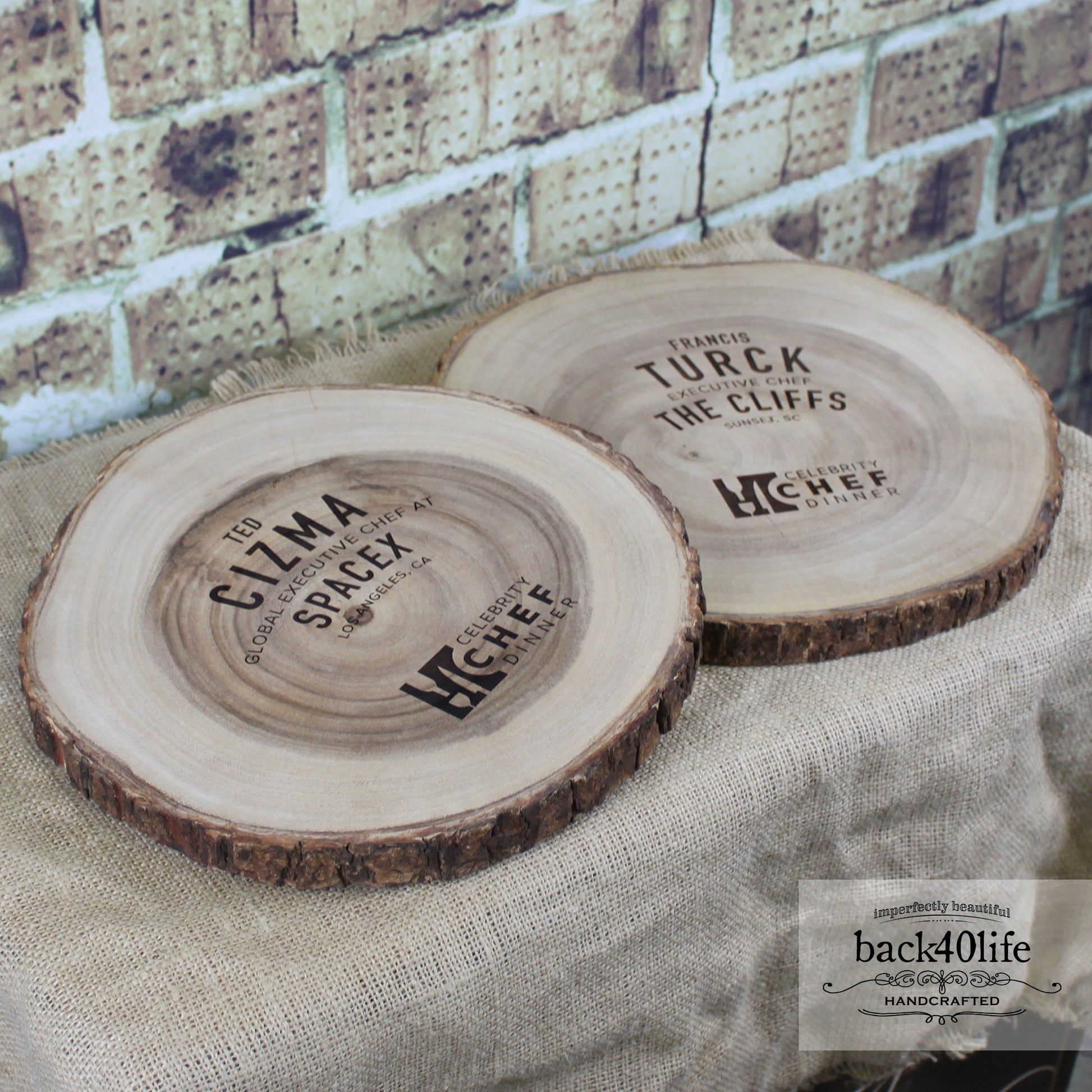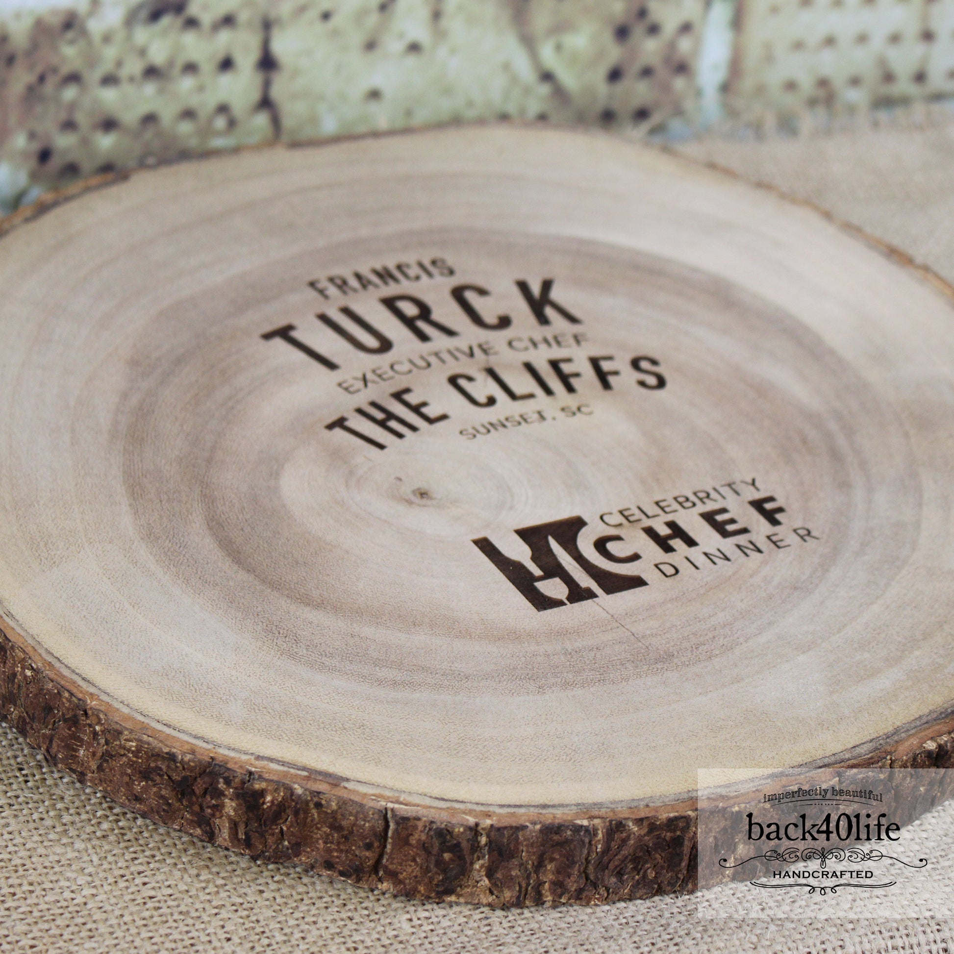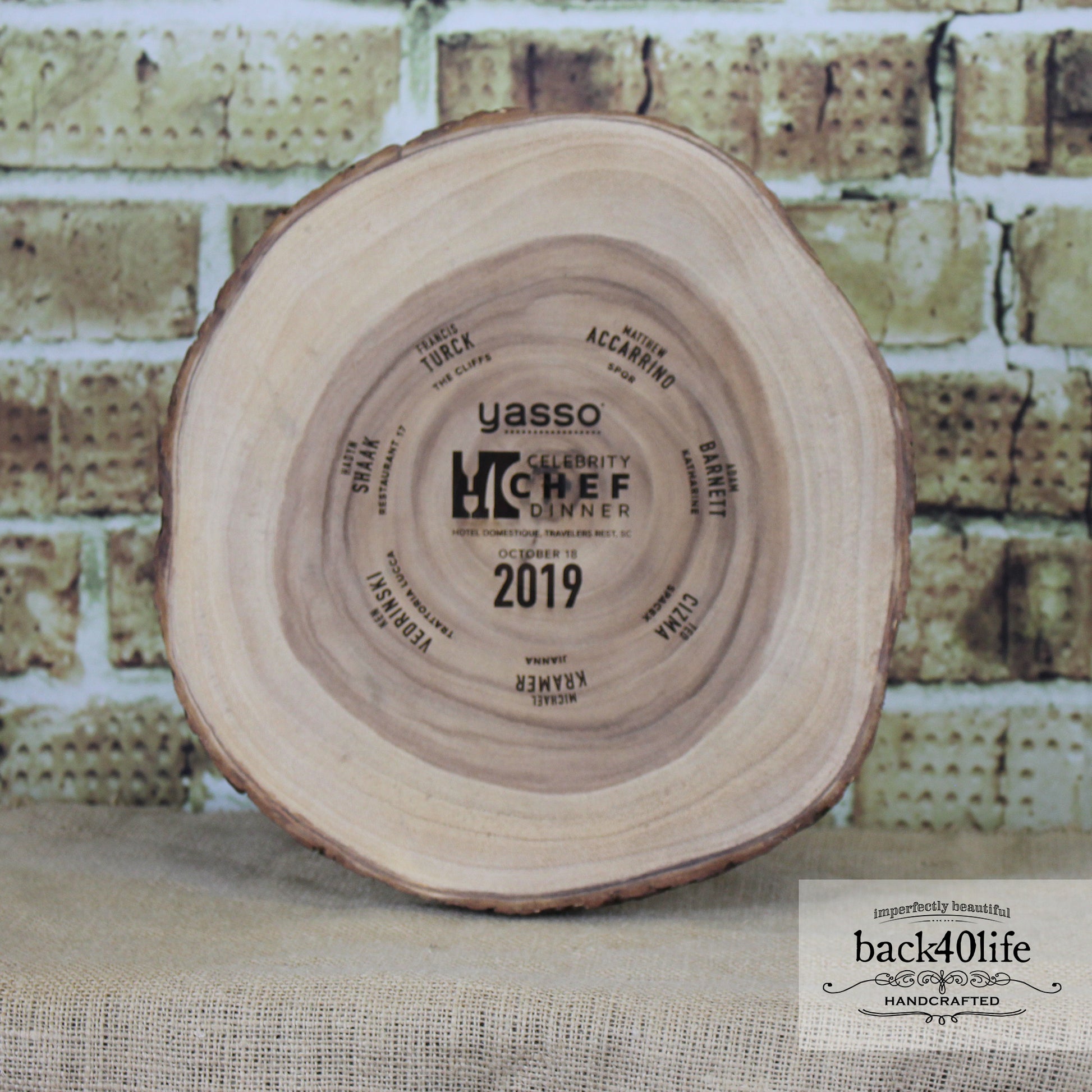 These tree rings were created for a celebrity chef dinner. The event branding and participants' names were engraved into the raw wood. These were used as a place for the chefs to place their finished food during the event.